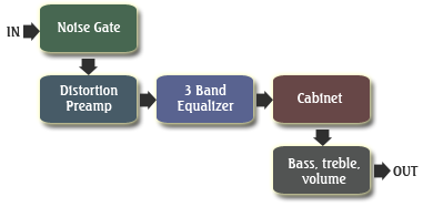 This is followed by a Preamp-Distortion unit, and a 3-line Equalizer (with a specific cut-off point frequency for every Preamp-Distortion unit)